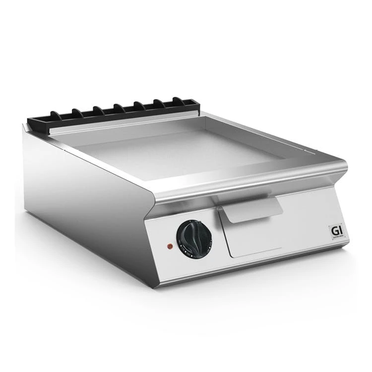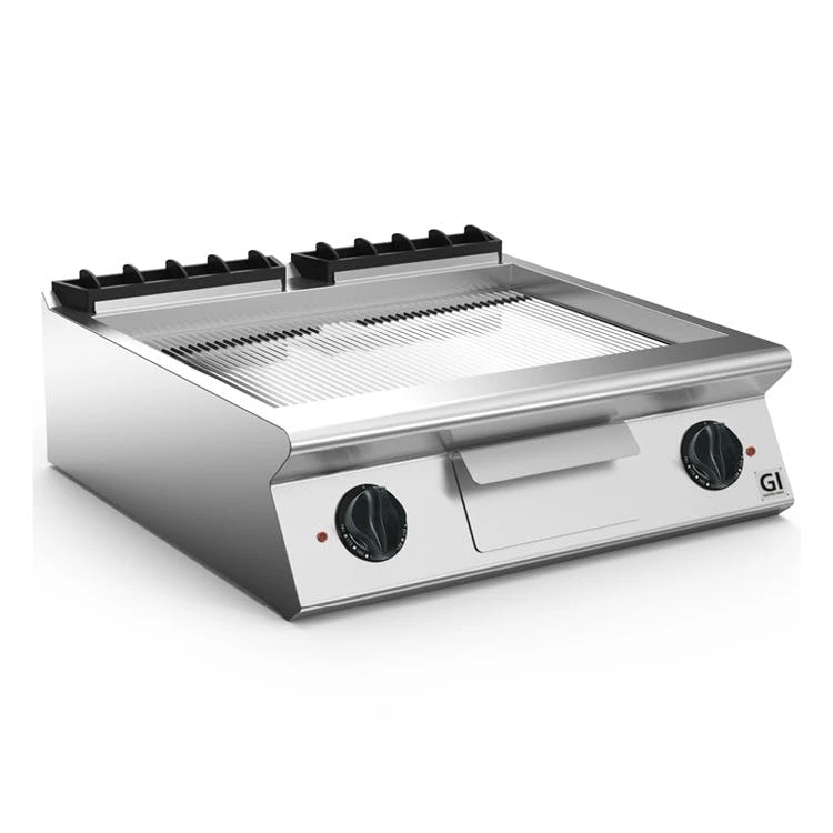 Gastro-Inox 700 “High Performance” Elektro-Grillplatte sind in verschiedenen Oberflächenausführungen erhältlich, d.h. Edelstahl, Edelstahl und verchromt, aber auch glatt, komplett gerippt oder 2/3 glatt und 1/3 gerippt. Die Grillplatte haben eine kurze Aufheizzeit, eingebaute Auffangwanne, stufenlos thermostatisch regelbar von 0°C – 300°C pro Zone, Sicherheitsthermostat. und sind leicht zu reinigen.