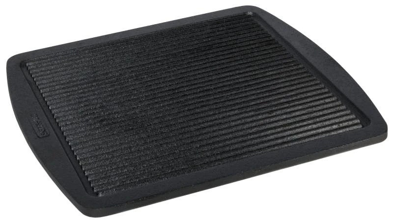 Brat – und Grillplatte GN 2/3, ganz aus Gusseisen, eine Seite plan, die andere Seite hat eine geriffelte Oberfläche zum Braten oder Grillen